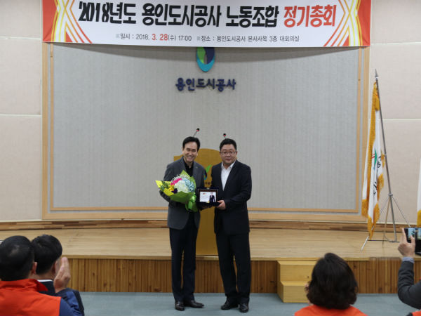 용인도시공사 노동조합은 지난달 28일, 김한섭 사장과 양희정 노조위원장 등이 참석한 가운데 2018년도 정기총회를 개최하였다. 노동조합은 최근 타결된 단체 및 임금협상 결과 등을 발표하는 한편, 지난 해 조합에서 추진한 기부, 봉사활동 등의 성과와 올 한 해의 활동 계획을 설명하였다.