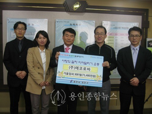 서울시 동작구 신대방동에 있는 등산용 아웃도어 전문브랜드 업체인 (주)에코로바 조병근 대표이사가 8일 오전 10시 유경 처인구청장을 방문, 불우이웃을 위해 써달라며 등산용 겨울점퍼 300벌(7천여만원 상당)을 기탁했다. 처인구는 기탁 성품을 읍·면·동을 통해 관내 저소득층에게 전달할 계획이다. 1991년에 설립한 (주)에코로바는 작년에 겨울점퍼 500벌을 기탁하는 등 저소득층 불우이웃 사랑을 몸소 실천하고 있는 업체이다.