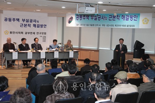 지난 10일 용인시의회 공부만세 연구모임(대표자 박재신의원)은 죽전도서관 시청각실에서 이상철 용인시의회 의장을 비롯해 연구모임 회원인 김선희, 고광업, 지미연, 추성인의원과 주민 100여명이 모인 가운데 공동주택 부실공사의 근본적 해결방안에 대한 세미나를 개최하였다.