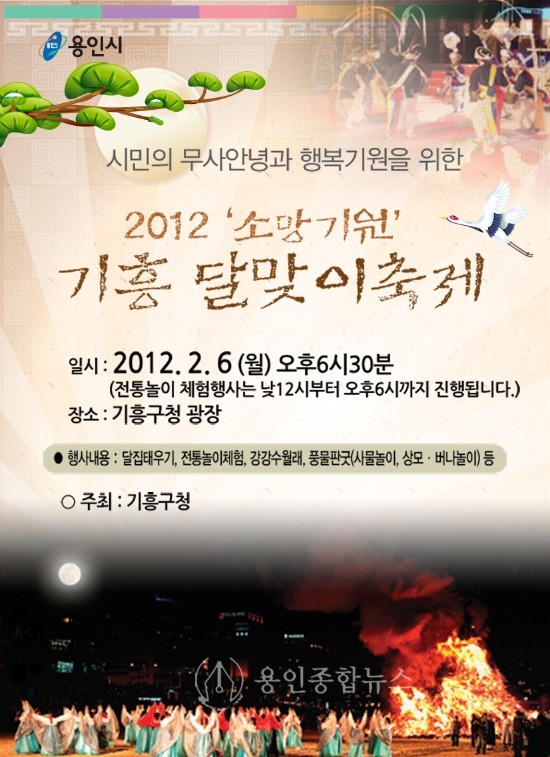 용인시 기흥구(구청장 이재문)는 2월 6일(월) 오후 6시30분부터 기흥구청 광장에서 ‘2012 소망기원 기흥 달맞이축제’를 개최한다. 이번 행사는 우리나라 고유명절인 정월 대보름을 맞아 구민의 무사안녕과 행복을 기원하고 전통 세시풍속 체험을 통해 세대간 조화와 애향심을 높이기 위해 마련되었다.