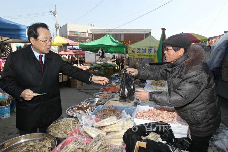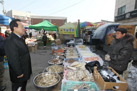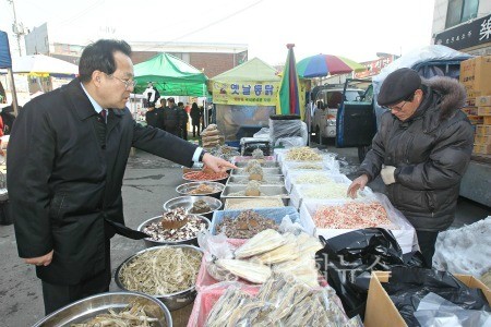 김학규 용인시장이 16일 처인구 백암면 백암장터에서 열린 전통 오일장을 둘러보고 주민과 대화를 나누는 시간으로 전통시장 상인들의 애로사항을 현장에서 청취하여 시정에 반영하기 위해 추진되었으며, 김 시장은 민생탐방을 통해 "지역 상인들의 애로사항을 듣고 전통시장 활성화를 위해 노력해 나가겠다."고 밝혔다.