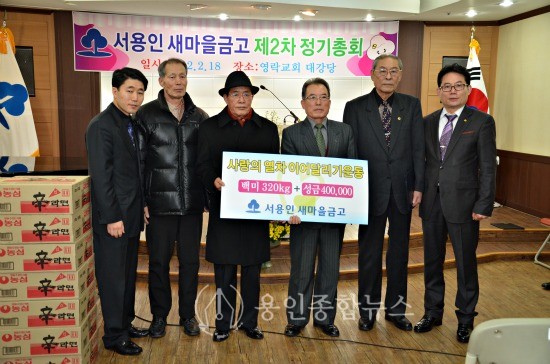 이날 총회에 앞서 용인시에서 추진하고 있는‘사랑의 열차 이어달리기운동’에 서용인새마을금고가 동참하며, 백미320kg과 현금 400.000을 죽전1동(동장 조성권)에 기탁하기도 했다. 또한 죽전1동 어르신들에게 감사장을 전달하기도 하였다.